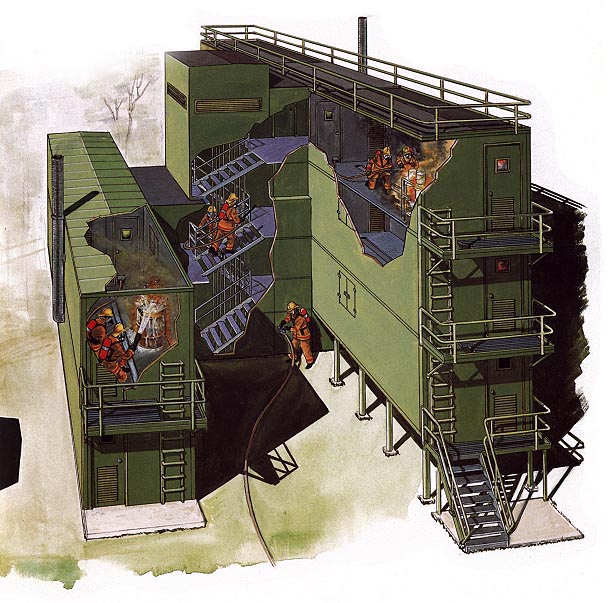 ICS can build modular units to cost effectively create a burning building complete with a range of internal fire simulators. The units are complete with a full array of safety systems to protect instructors and trainees alike.